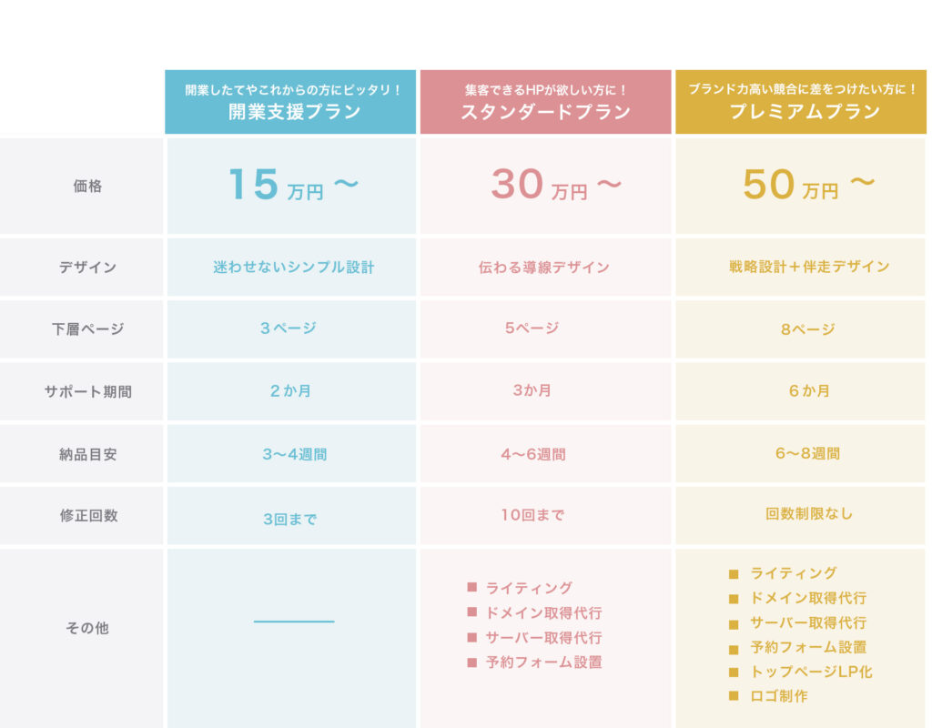 ・問合せフォーム設置 ・CMS設置 ・基本SEO 納品後サポート